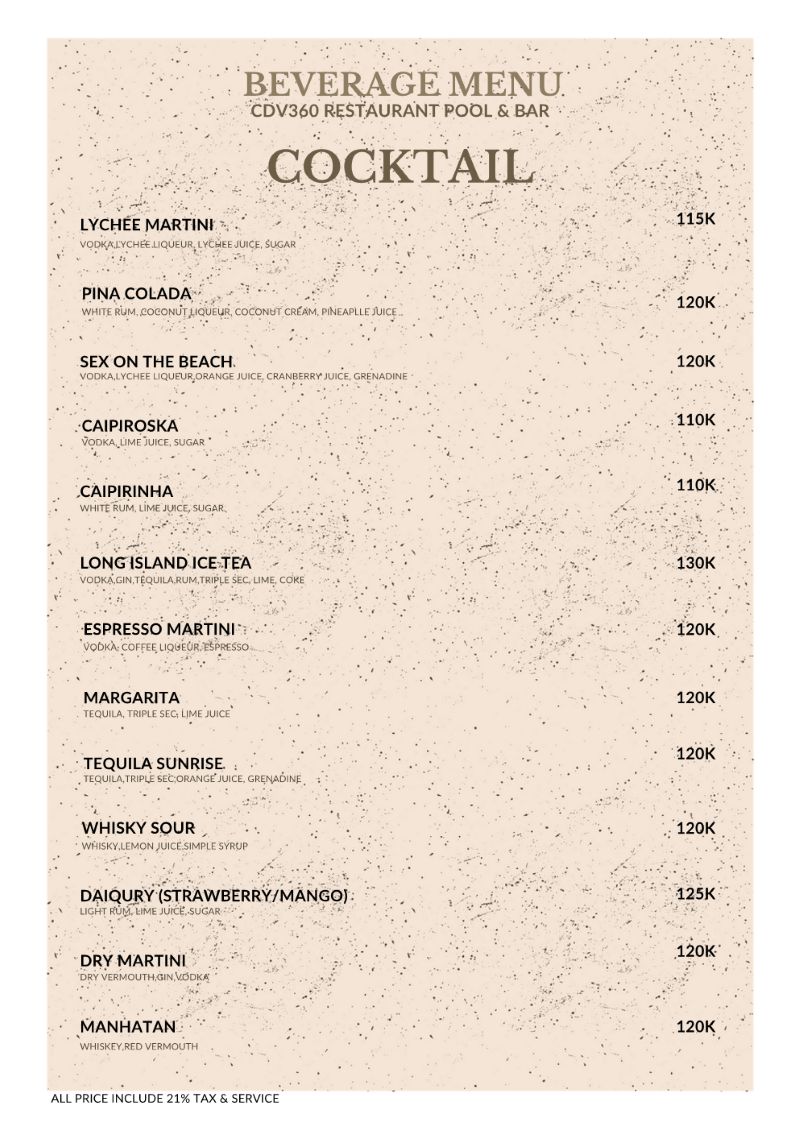 CDV360 Restaurant & Pool Bar invites you to experience a delightful fusion of Indonesian and Western cuisine. Enjoy the rich flavors of our carefully crafted dishes, perfect for those who appreciate variety and quality in every bite.