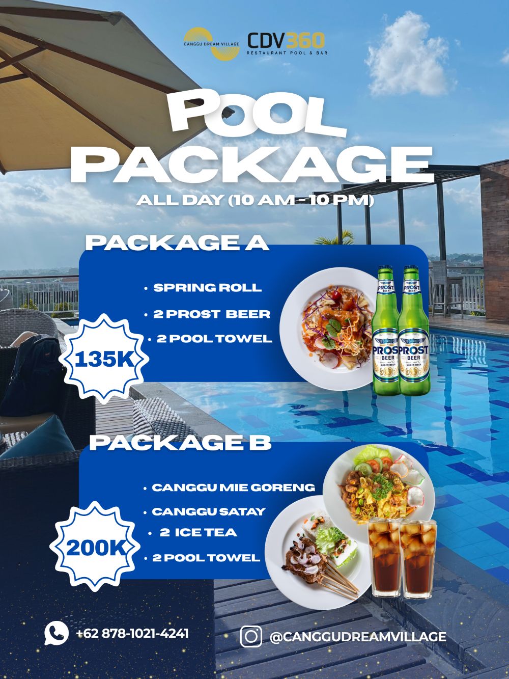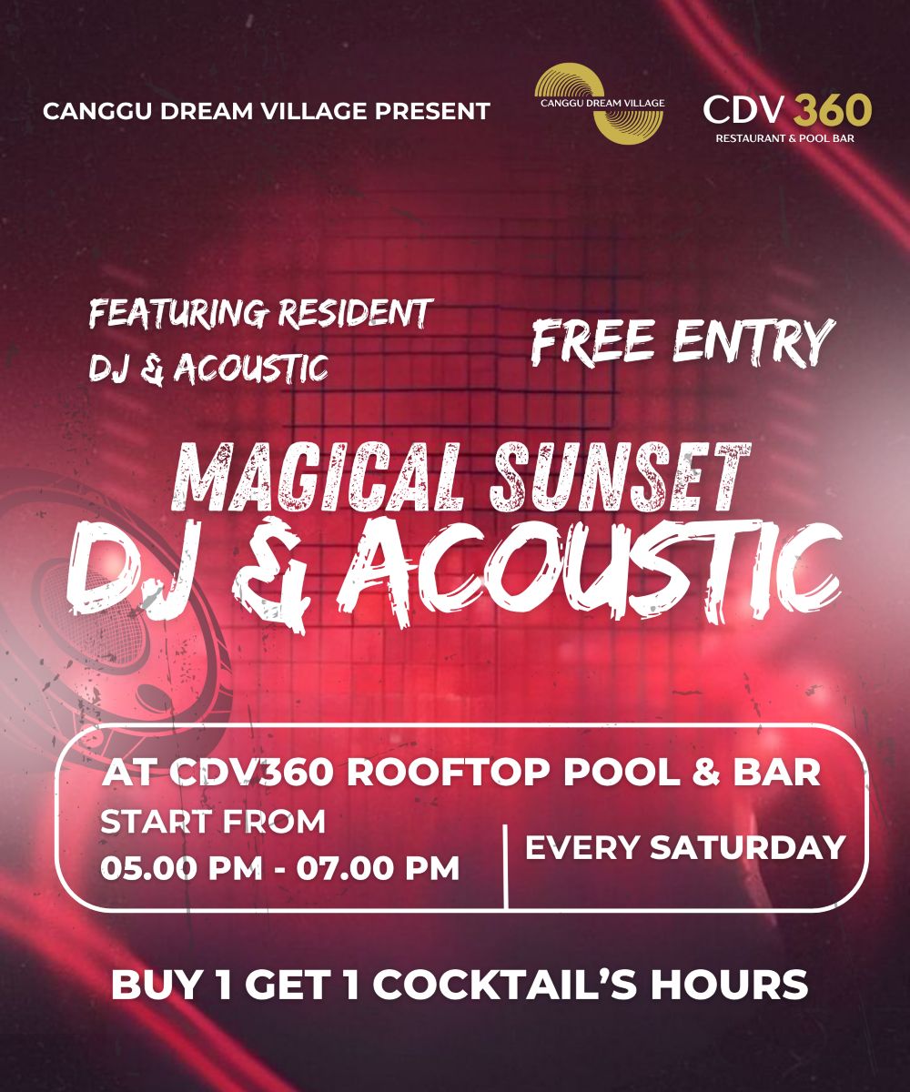 Join us every Saturday from 5:00 PM to 7:00 PM for a magical sunset experience at CDV360 rooftop pool & bar. Featuring our resident DJ and Acoustic. Enjoy free entry and groove to the beats as the sunset over Canggu. Plus, don’t miss out on our buy 1 get 1 cocktail during sunset hours.
