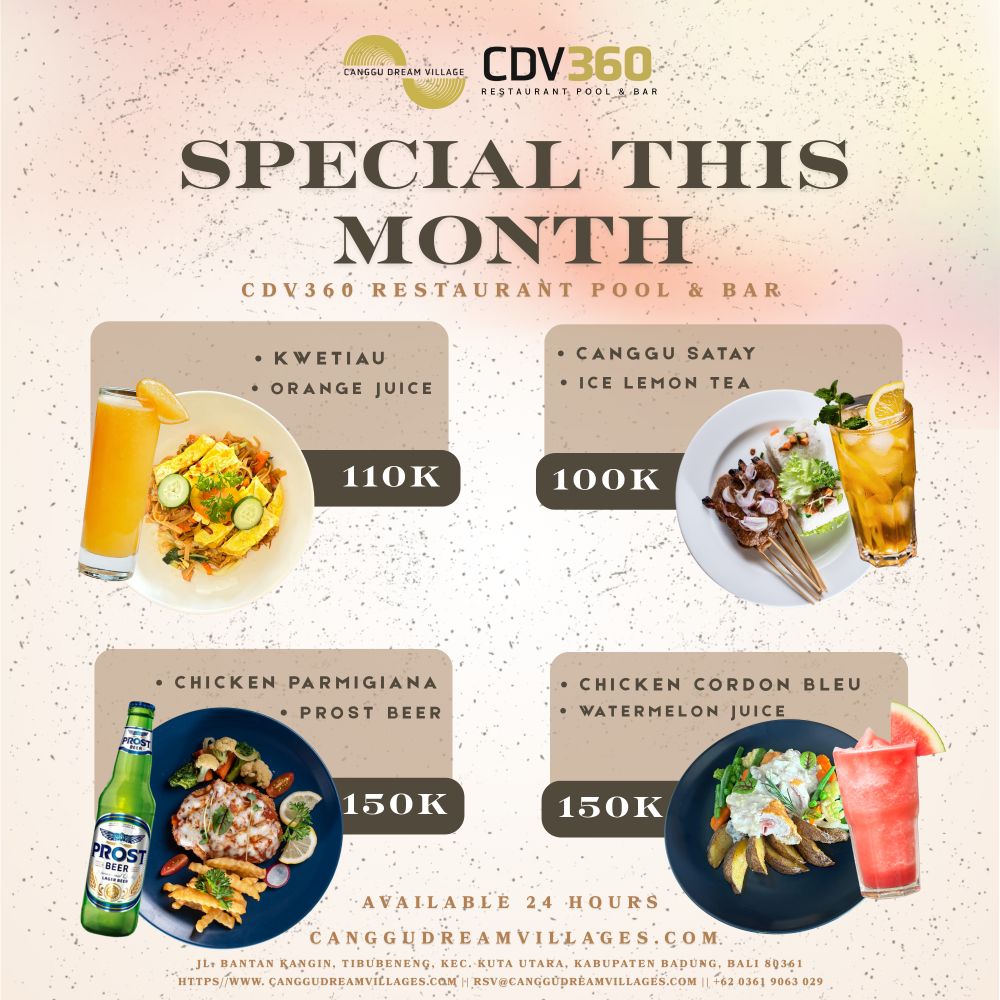 Discover our Special Menu of the month at Canggu Dream Village. This exclusive menu is available 24 hours a day throughout the month